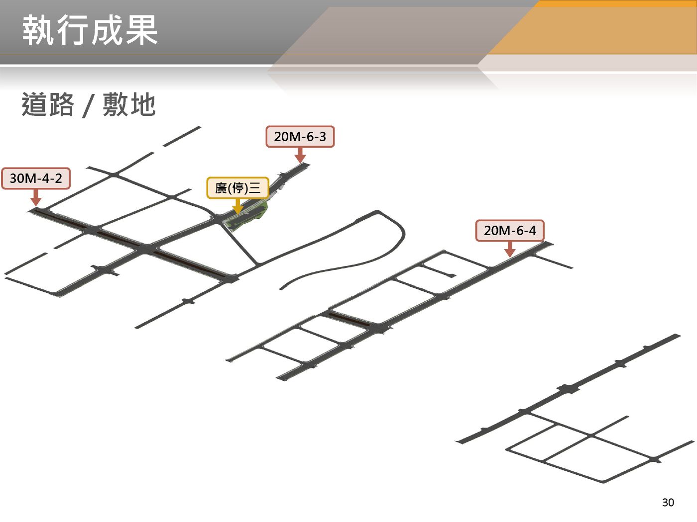 - 道路人行道景觀20M-6-4、20M-6-7、30M-4-2、20M-6-3已完成。
